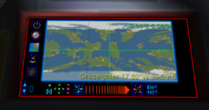 In map mode, the display shows a map projection of a planet. The spacecraft must be near a planet to use map mode. Pink areas on the map show relative city density. The position of the spacecraft is displayed as a small cross-shaped blip that alternates between black and white.
