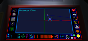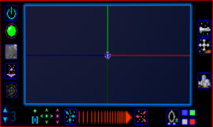 The transporter station's primary display is very similar to the sensor station. Refer to the Sensor_Station page for a key to the information displayed. Display rotation and magnification is controlled using green and pink controls at the bottom right, similar to the sensor station. Declutter switches appear in a column at the right and function just like those on the sensor station.